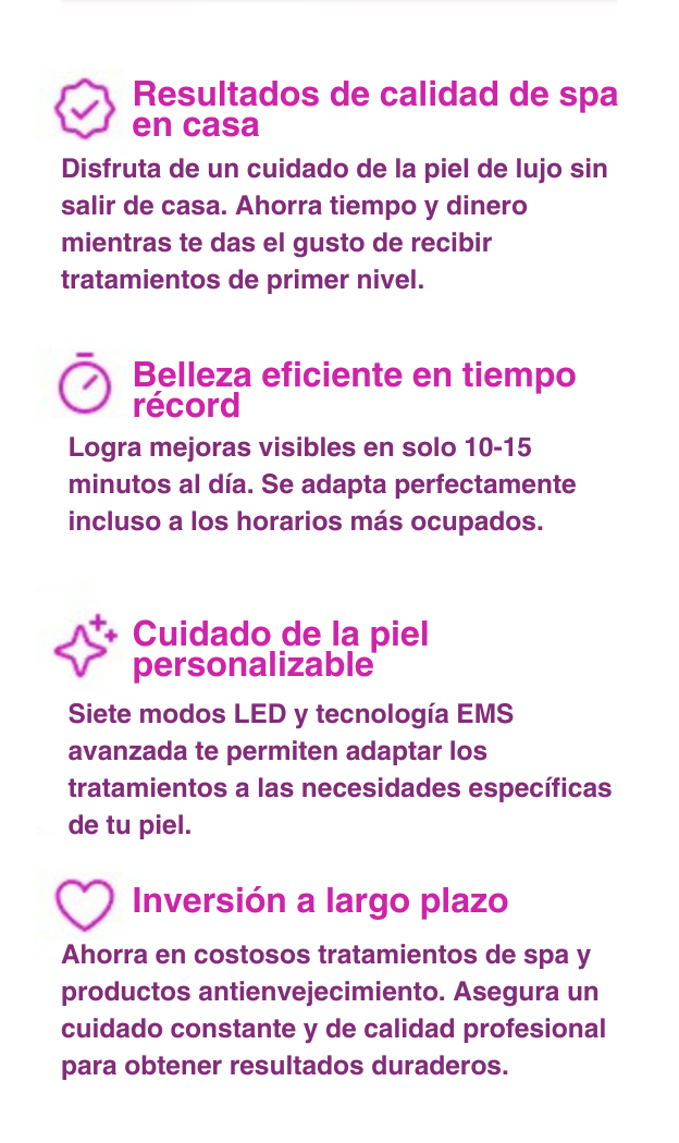 Nuestro dispositivo premium ofrece masajes dirigidos que afinan el cuello y el rostro mediante EMS, brindándote un efecto lifting notable y promoviendo la simetría facial en el proceso.