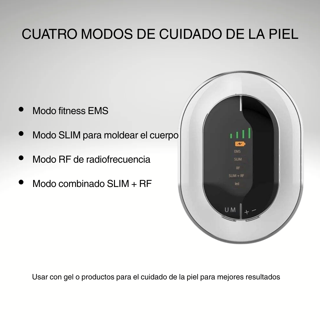 Nuestro dispositivo de radiofrecuencia activa la regeneración natural del colágeno, ayudando a mejorar la firmeza y elasticidad de la piel desde las capas más profundas. Gracias a la combinación de tecnologías EMS, RF, Slim y Slim+RF, favorece la absorción de los principios activos de las cremas para potenciar los resultados en menos tiempo.